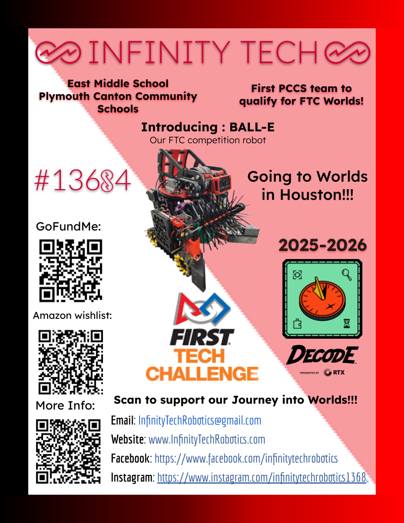 Infinity Tech Robotics has made history by becoming the first Plymouth-Canton Community School District middle school team to earn advancement to the World Championship. This honor is only for the top 336 teams out of 15,000+ teams across the world. The World Championship takes place in Houston, Texas, from April 29th through May 2nd, 2026, and we need your help getting there. At our qualifiers, we earned 1st Place Alliance (robot performance) and 1st Place Inspire Award (presentation and portfolio of overall team), which advanced us to the State Competition. We won the Finalist Alliance (3rd place robot performance) and 3rd place Inspire Award (presentation and portfolio) at the State Competition for an overall 4th place, which earned us advancement to the World Competition. We can’t do it without the help of our community!